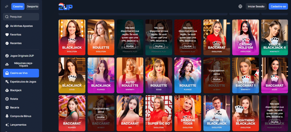 O cassino ao vivo do 2UP.io se destaca pela variedade de jogos populares e pela organização em subcategorias específicas, como: